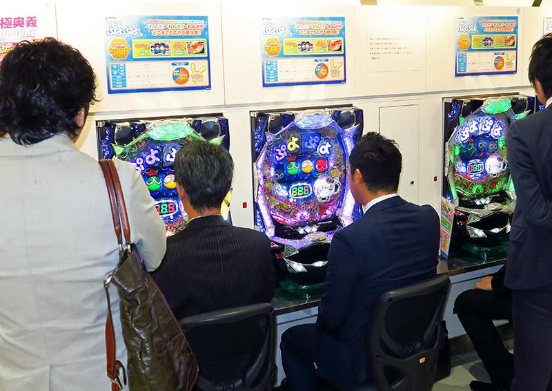 「ぷよぷよ」は昨年25周年を迎えた国民的なアクションパズルゲーム。そのゲーム性をどのようにパチンコで表現したのか、訪れたホール関係者は試打を行いながら確かめた。