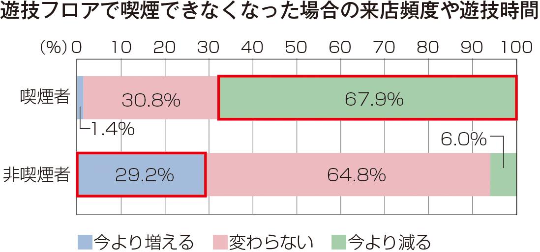 受動喫煙防止対策の強化によって遊技フロアで喫煙できなくなった場合の来店頻度や遊技時間の変化を尋ねたところ、喫煙者の67.9%は「今より減る」、非喫煙者の29.2%は「今より増える」と回答した。なお本調査の喫煙者率は55.1%だった。JTが7月に発表した2017年全国たばこ喫煙者率調査(19.3%)より35.8ポイント高い。