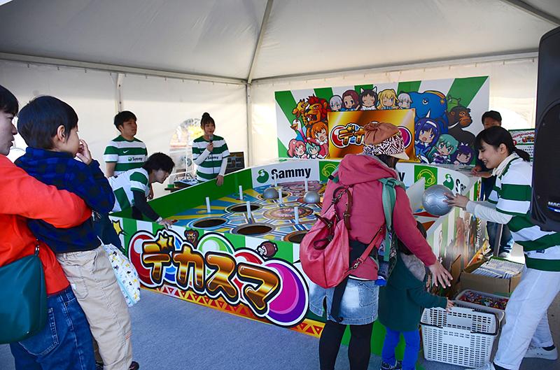 サミーはコースの拠点となった新城総合公園内にブースを出展。3メートルを超えるスマートボール「デカスマ」のほか、人気のアーケードゲーム「頭文字D ARCADE STAGE Zero」の体験機、オリジナル抽選機「サミーチャレンジ」を設置した。