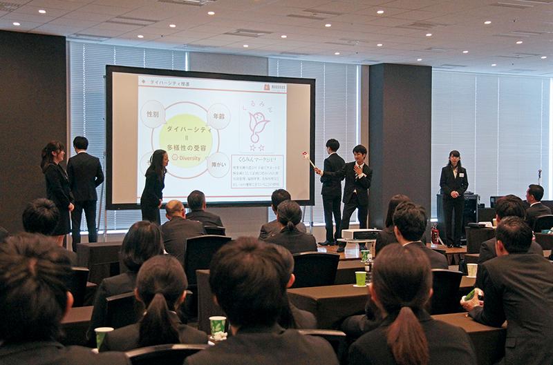 マルハンは11月6日、都内会議室で宿泊型インターンシップ「戦国浪漫~道なき道を切り拓け~」の最終段階である「決戦」を開催。5組28人のインターンシップ生が韓裕社長をはじめとする幹部役員を前に、熱意を込めたプレゼンテーションを行った。