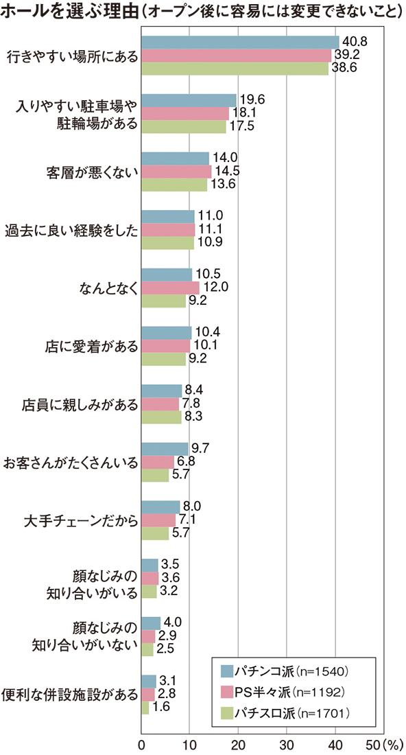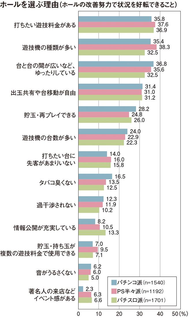 一方、パチスロ派はほかのパチンコ派、PS半々派に比べて、遊技で勝ちにこだわるリターン重視派の割合が高い(32.8%)。そのため立ち回りなどの参考にしようと、充実したデータ公開などがあるホールを選ぶ割合が高くなったとみられる。