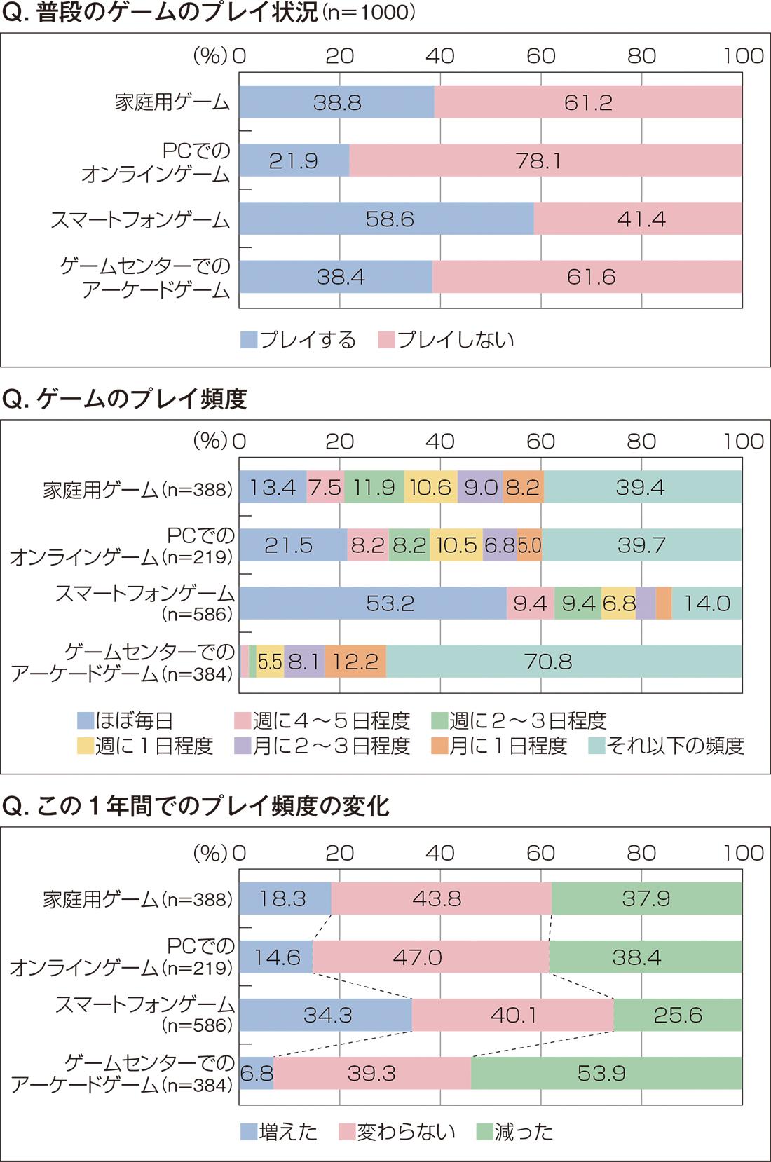 ここ1年でのプレイ頻度の変化でも「増えた」と回答したのは「スマートフォンゲーム」が最も多かった。一方で「アーケードゲーム」は53.9%が「減った」と回答した。