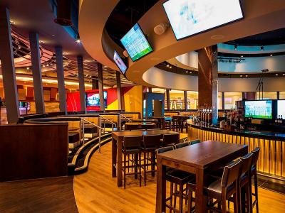 ゲーミングフロアには200席のスポーツバーがある。180度のスクリーンを複数備え、世界各地の様々なスポーツの映像が流れる。ゲンティンUKでは英国内でスポーツブッキングを提供するゲンティンベットドットコムという会社を持っている。チャールズさんは「ライブで見ながら(スマホなどの)携帯端末で賭ける。人気があるのはサッカー、ボクシング、ゴルフなどですね」と話す。