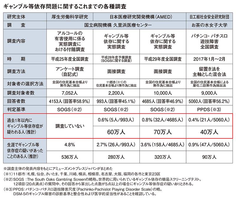 篠原 この2つの調査の示す実態はほぼ同じです。研究班の結果は70万人でしたが、このうち、主に「パチンコ・パチスロ」を遊技している人は約8割、約56万人です。これでも社安研の結果より16万人多いのですが、この差はカットオフ値の扱いの違いです。