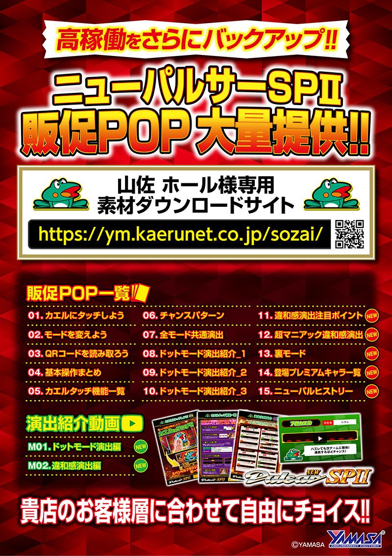山佐は現在好評稼働中の『ニューパルサーSPⅡ』をさらに盛り上げるため、販促POPや演出紹介動画を無料で提供している。POPは「基本操作」「チャンスパターン」といった初心者向けから「裏モード」「超マニアック違和感演出」などの上級者向けまで全15種類を用意。客層に合せて自由にチョイスができる。下記アドレスからダウンロードが可能。