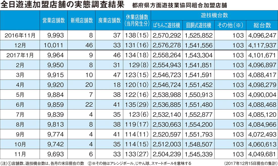 全日本遊技事業協同組合連合会が毎月実施している組合加盟店舗数調査によると、11月末時点での営業店舗数は9693軒。新規出店は6軒、廃業店舗が33軒で、営業店舗数は前月比で49軒減少した。
