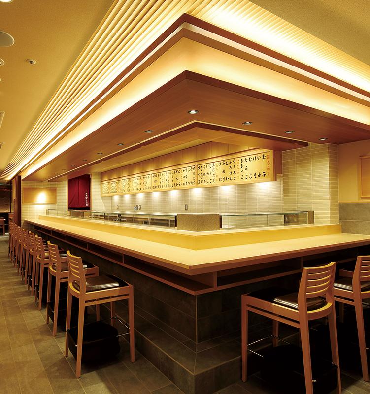 カウンターやテーブル席が引き立つ間接照明や行灯使いで、空間にメリハリをつけた