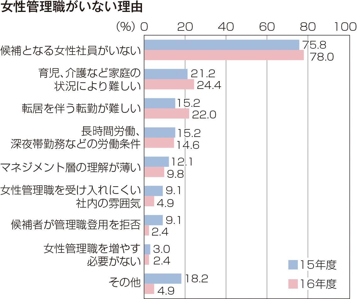女性管理職がいない理由(複数回答)として最も多く挙げられた項目は、「候補となる女性社員がいない」(78.0%)だった。次いで「育児、介護など家庭の状況により難しい」(24.4%)、「転居を伴う転勤が難しい」(22.0%)の順。