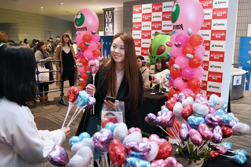 ラジオブースは両日とも、ライブイベントが開演するまでの1時間限定でオープン。記念撮影を終えた来場者にサミーオリジナルのハート型バルーンをプレゼントした。そして、サミー公式Twitterをフォローしてくれた方にオリジナルのスマホリングをプレゼントした。