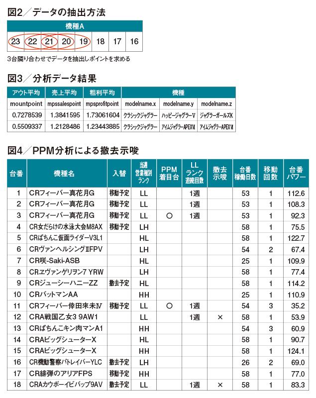 この得点を元に遊技機PPM分析 (横軸が稼働、縦軸が粗利の図表をつくり、その遊技機がどの営業パワーポジションに位置するかを分析)を行えば、撤去時期や移動対象となるかなどの検討ができる。稼働と粗利の高(High)・低(Low)で、HH(金のなる木)、HL(花形)、LH(問題児)、LL(負け犬)の4つに分類するが、中央付近の領域内にある台もPPM着目台としてマークする。
