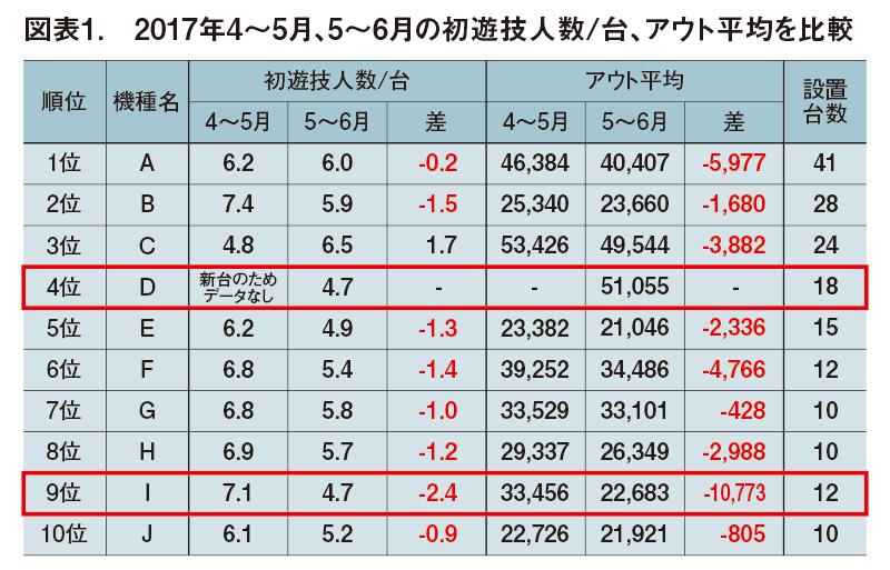 この「初遊技分析」はホールでどのように活用されているのか。Xホールのデータを見てみよう。Xホールは駅前多層階で設置台数約600台。年配客や主婦層が中心の店だ。図表1はこの店の17年5月と6月の「初遊技人数」を対比したもの。この中で着目したいのは、6月時点で初遊技人数が最も少ない4位の機種Dと9位の機種Iだ。