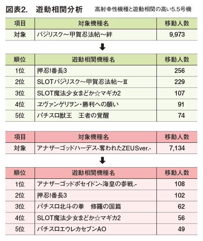 その結果を表したのが図表2だ(約半年間のデータ)。どの機種でも移動人数が多いのが『押忍!番長3』だが、やはりゴッドシリーズファンは『アナザーゴッドポセイドン‐海皇の参戦‐』に最も多く移動している。