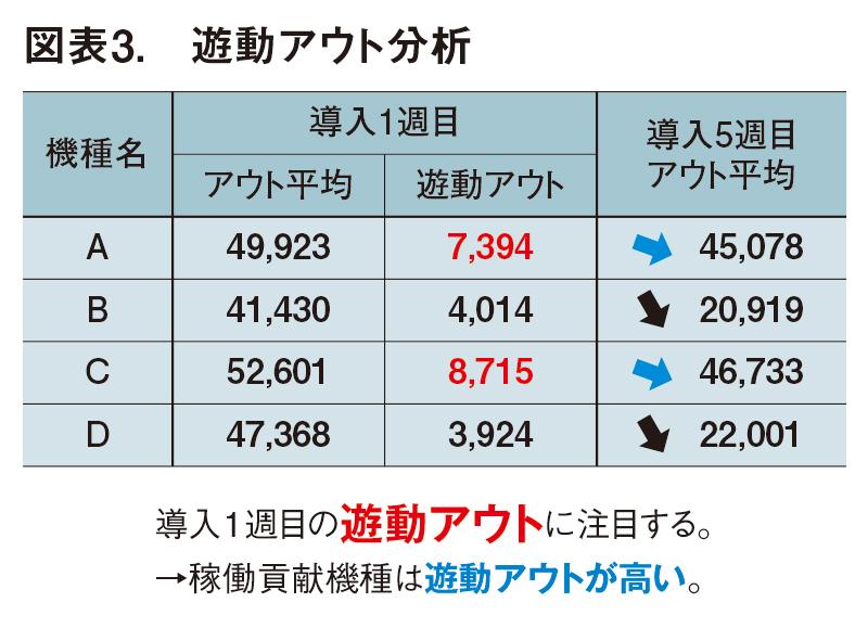 図表3は4月と5月にリリースされたミドルタイプの新台の稼働推移。導入1週目のアウトと遊動アウトの結果を並べた。新台はどのような機種であっても、初週は高めのアウトを記録する。台データだけでは、どの機種がファンに支持されるか、もしくはすぐに飽きられるかを判断することは難しい。