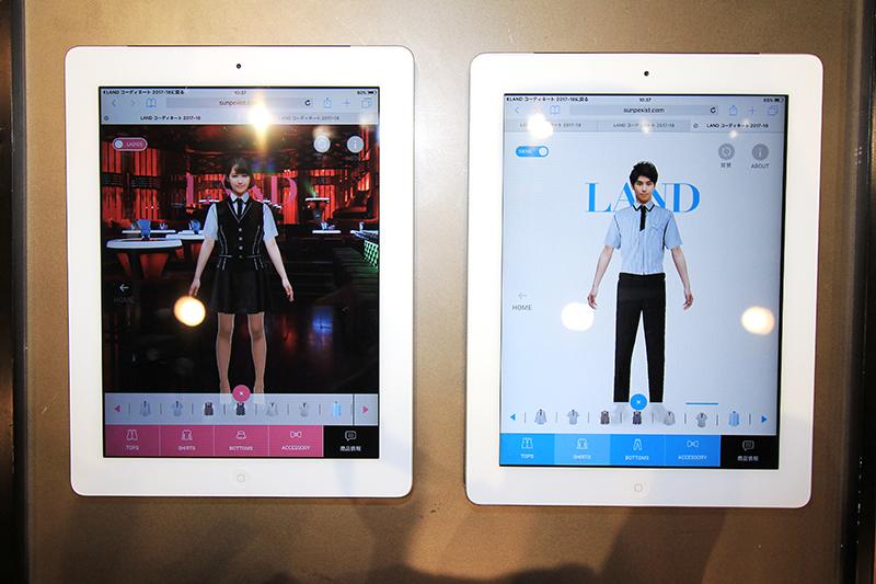 同社は「最強コーデ」を見つけるためのWebアプリも開発。着せ替えコンテンツの各カテゴリーからアイテムを組み合わせて、自店だけの最強コーデを見つけられる。ホール空間のような背景色を選ぶことで、店舗での映え方も容易にイメージできる。