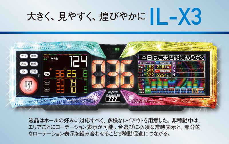 呼出しランプの代名詞で圧倒的支持を集めるIL‐Xシリーズが3年ぶりにモデルチェンジされた。呼出しランプとして業界最大級の幅473ミリボディと7インチワイド液晶を搭載。従来の7セグではなく、業界で初めてVA液晶を採用した。車のスピードメーターなどに搭載されている技術で、7セグに比べてなめらかなフォント表現が可能。消灯セグが見えないので、文字がこれまで以上にくっきりと表示される。さらに輝度が高いため、「大当り」「スタート」などの表示を鮮やかな色で表現できる。