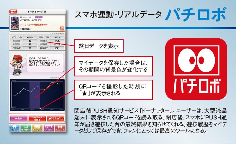 店舗や機種をまたいだ遊技データが保存できるマイデータ機能を搭載。自らメモをとらなくても、大型液晶端末から自動で実践データを保存できる。ファンにとって最高のサポートツールになり、来店動機にもつながるだろう。