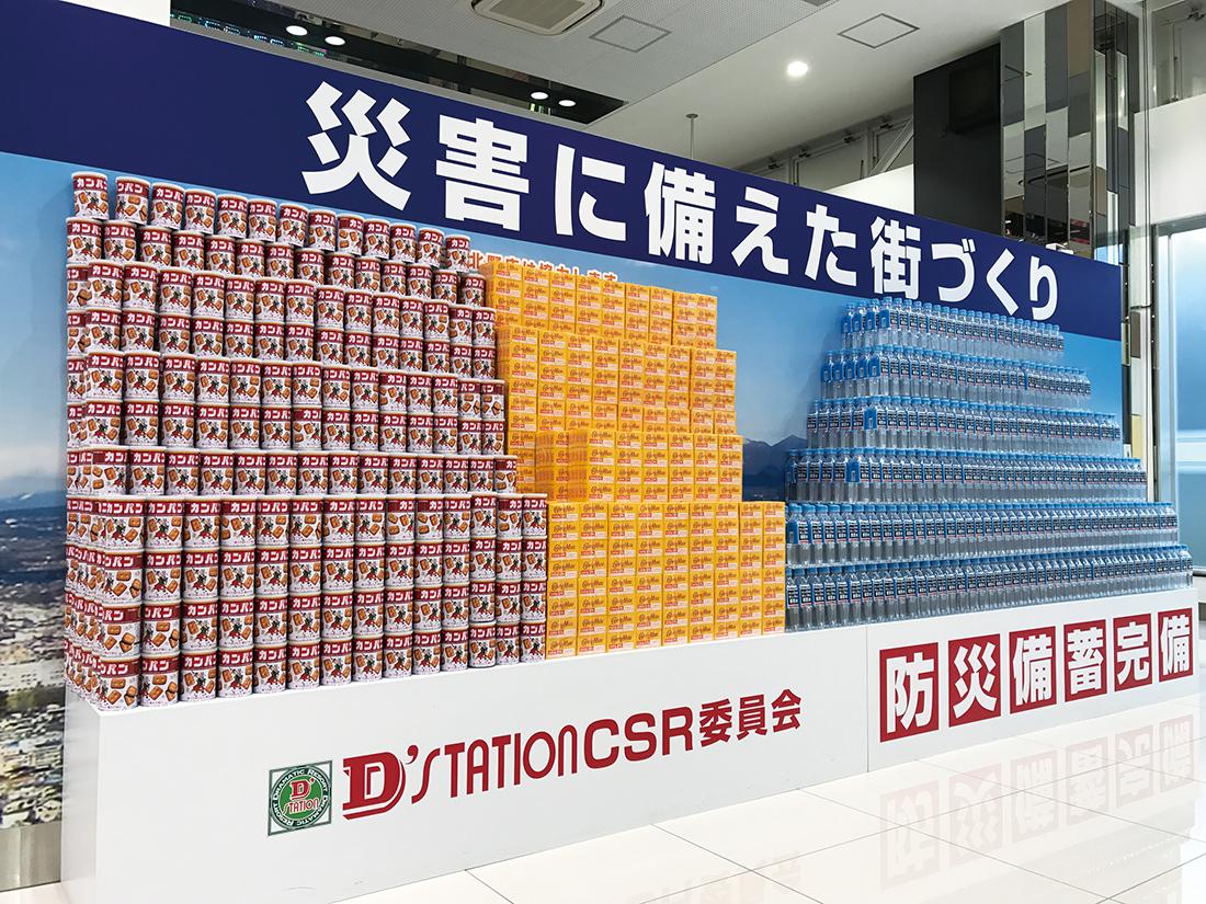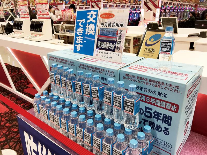 『D’ステーション』の屋号で全国にホールを展開するNEXUS(群馬県高崎市)は、グループ全店舗で水や簡易トイレ、乾パンなどを風除室などに設置している。店舗に物資を備蓄し始めた当初はバックヤードに置いていたが、民間施設などを活用した地域活性化を支援するNPO法人からアドバイスを受けたことを機に、来店客の目に触れる場所に置くようにした。