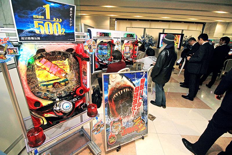 平和は3月8日、東京営業所ショールームで新機種『CR JAWS再臨‐SHARK PANIC AGAIN‐』の展示内覧会を開催。来場した多くのホール関係者が、実質稼働貢献55週を記録した前作を凌ぐ「無敵バトルシステム」を体感した。