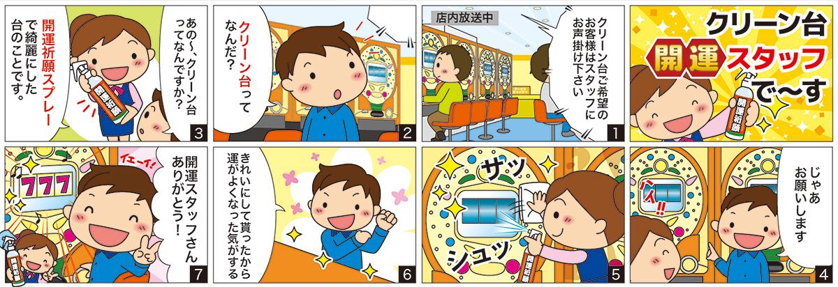 まず営業中にお客への声かけや店内放送、お客からの要望などから『クリーン台』のリクエストを受ける。次に「開運祈願」と書かれたスプレーをお客に見せて開運祈願。乾いたマイクロファイバータオルに洗浄液『WeSS』をスプレーし、遊技機を拭き上げる。パチンコは玉受け皿とハンドル部分、パチスロならストップボタン面全体とスタートレバーといった具合だ。そして拭き上げ後はお客に「開運祈願しました!」と笑顔を見せる。