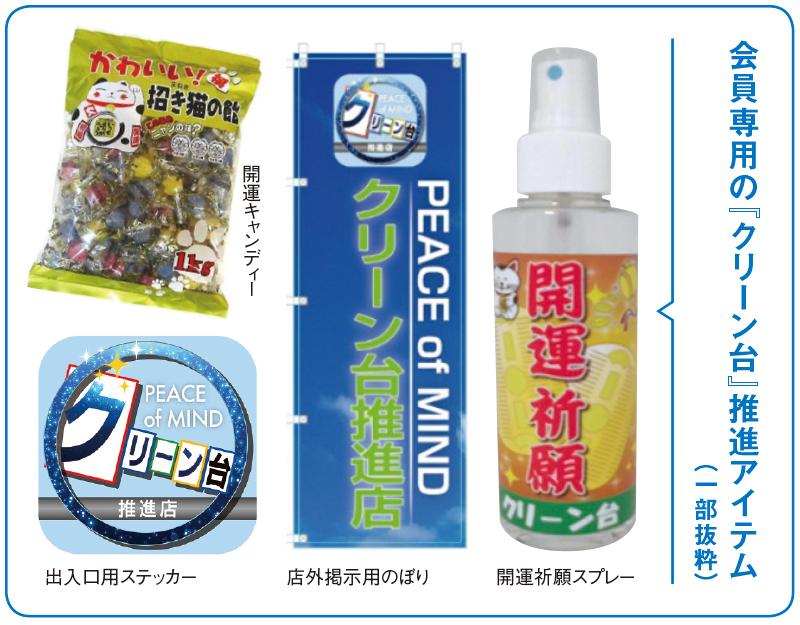 入会時に必要な購入品は①クリーン台専用洗浄液『WeSS』10リットル(1万円)、②クリーン台推進店ステッカー12枚(3000円)、③開運祈願スプレーボトル10本(3000円)の3アイテムで計1万6000円(消費税、送料、代引手数料別)。
