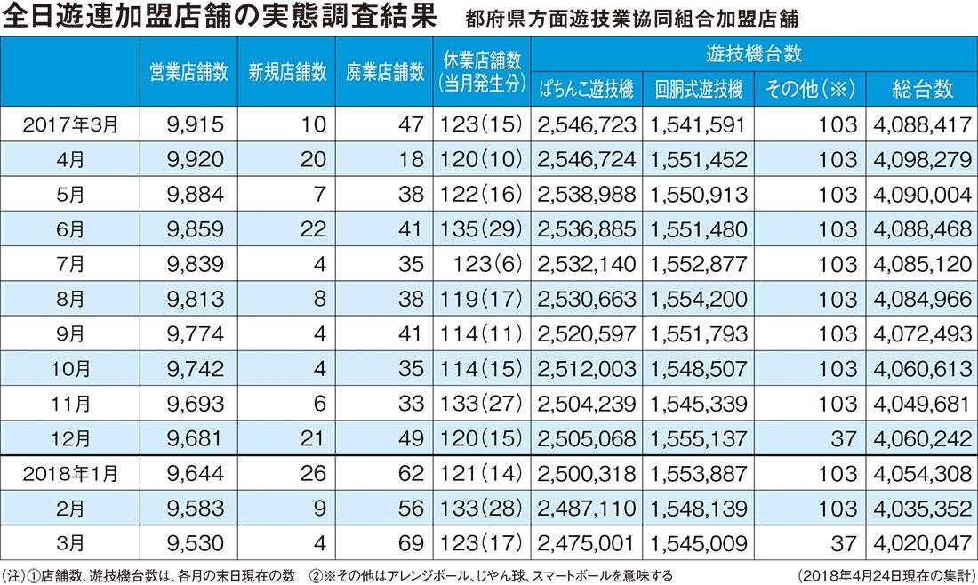 遊技機台数はパチンコが1万2109台減少。パチスロは3130台減少。総台数は1万5305台減少した。3月中の新規出店は4店舗、廃業店舗は69店舗だった。今年に入って廃業店の増加ペースは加速している。