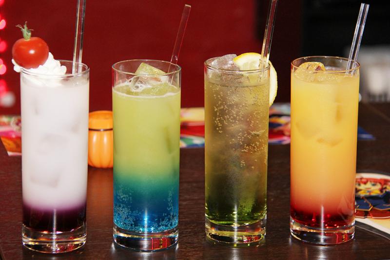 マジハロパフェ(1200円)は、4人のキャラをイメージした4種類。アリスはオレンジ色も鮮やかなマンゴー味だ。マジハロオリジナルカクテル(1500円)も4種類で、アルコール有・無が選べる。碧は、パイナップルジュースにブルーハワイシロップを加えた甘酸っぱいカクテルだ。