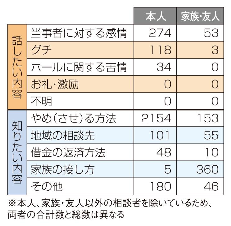 一方の「知りたい内容」では、パチンコ・パチスロを「やめる方法」もしくは「やめさせる方法」が2311件と最も多く、初回相談内容の71.8%を占めた。次に多かったのが「家族との接し方(366件)」だった。