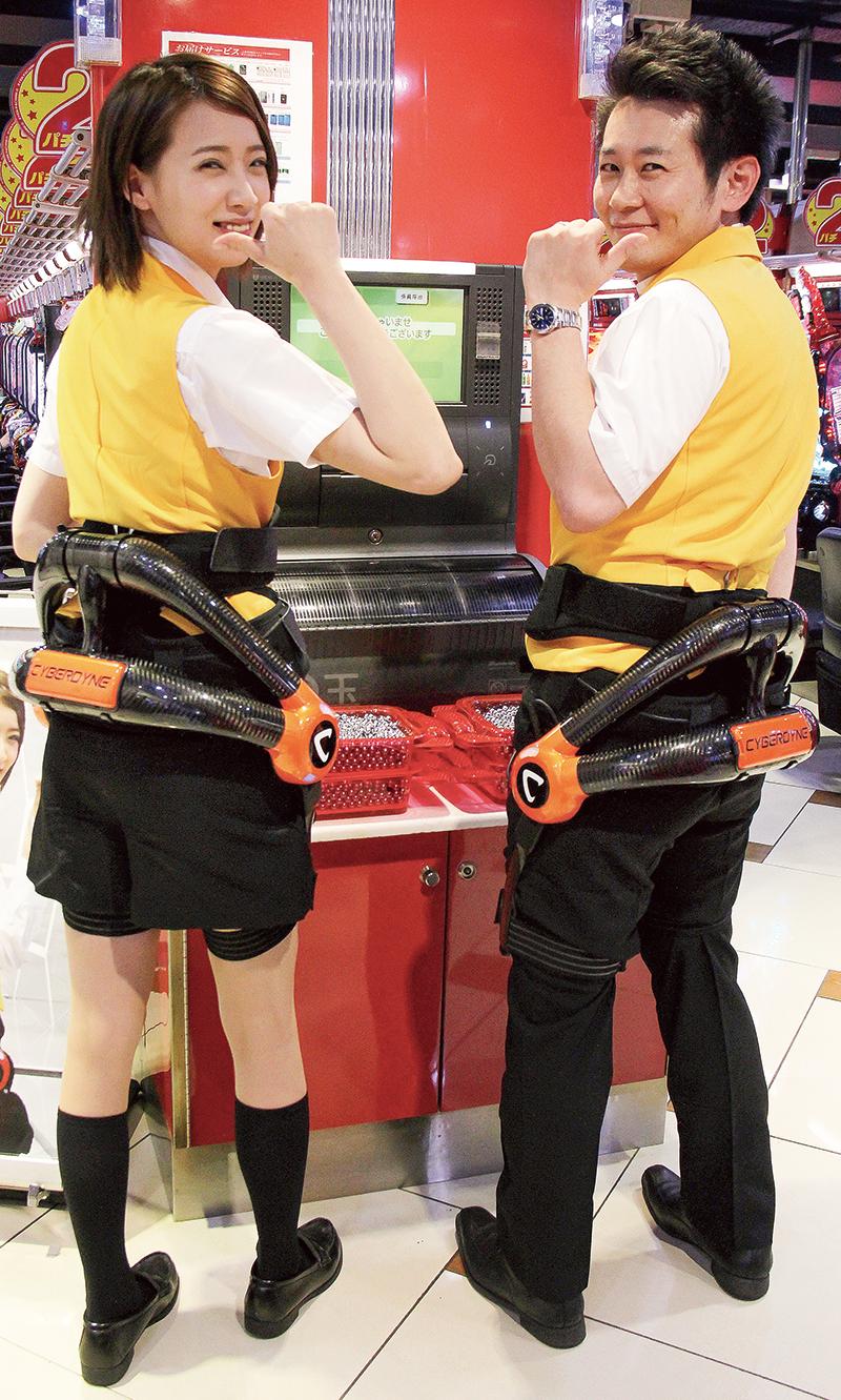 このスーツを着用することで、腰にかかる負荷が最大40%低減される。店舗で使用するのは、玉計数が増える夜の混雑時。ジェットカウンター前にロボットスーツを装着した専用のスタッフを配置する。