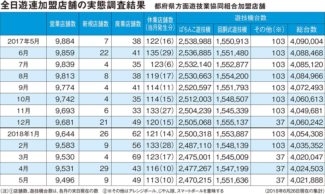 全日本遊技事業協同組合連合会の5月末時点の組合加盟店舗数は9496軒で、前の月と比べて35軒減少した。