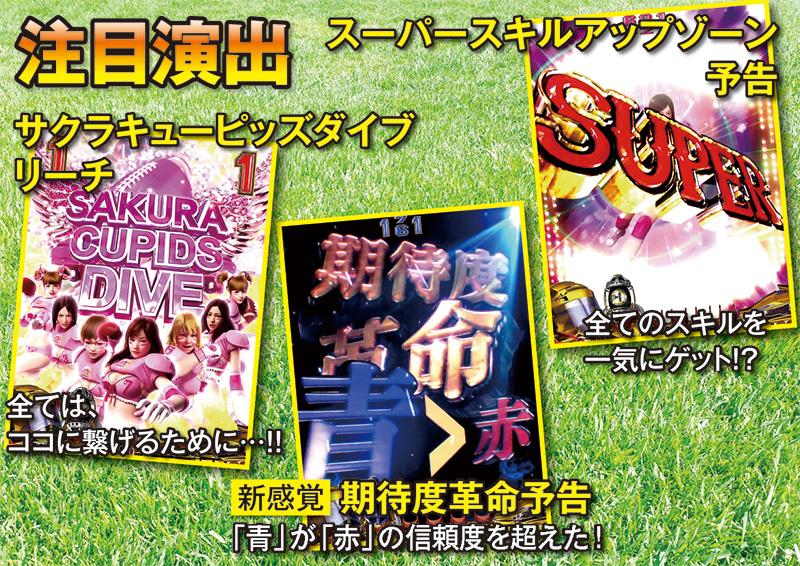 演出面では、青色が赤色の期待度を超える「期待度革命演出」を搭載。スーパーリーチ発展時に突如“期待度革命”の文字が現れたら、青色演出の期待度が赤色演出を上回る。
