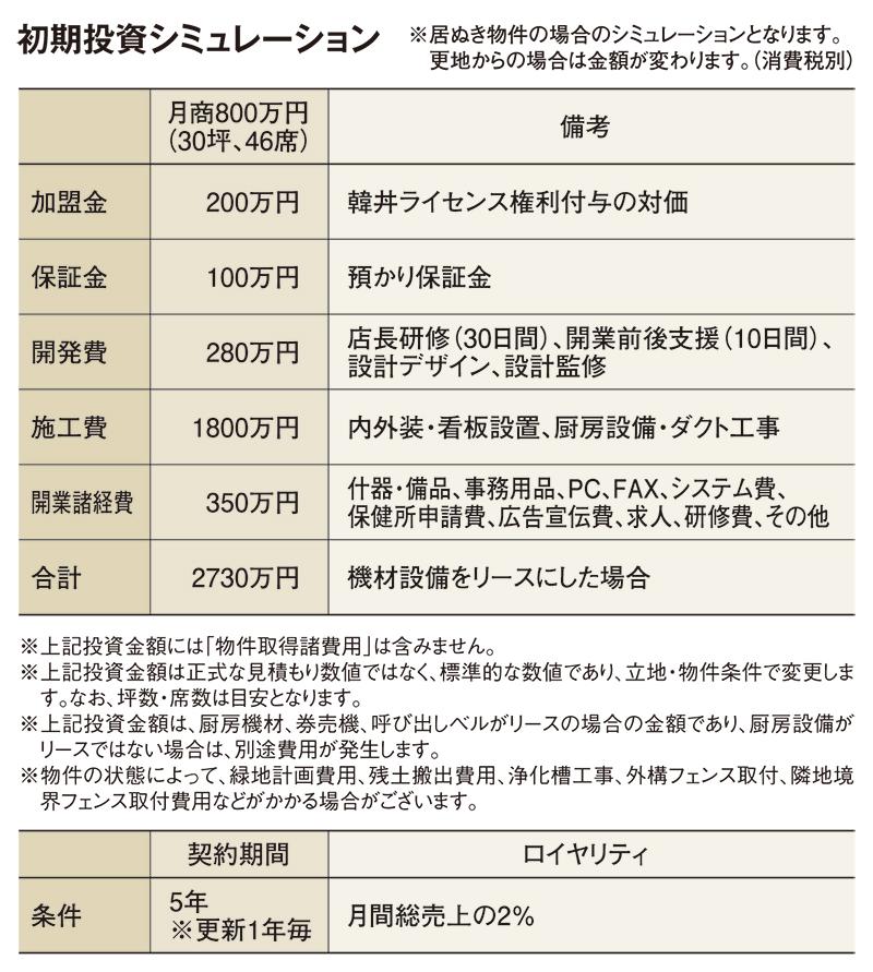 適正物件は郊外のロードサイド。建坪30坪以上で、駐車場は20台以上、居抜き物件でも可能だという。また、韓丼では30日間の店長研修を実施。加盟法人の不安を解消するとともに、ブランドイメージの維持を図っている。