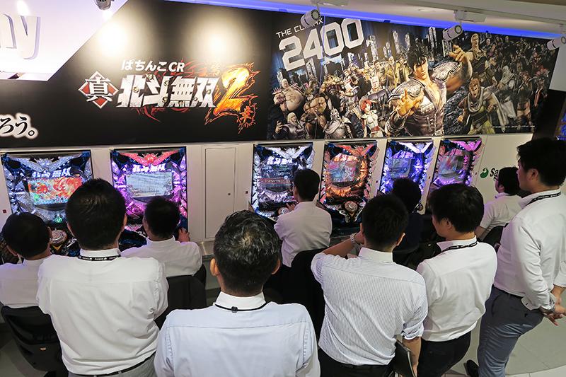サミーは7月3日、東京支店ショールームで『ぱちんこCR真・北斗無双 第2章』の内覧会を開催。いまなお好評稼働を続ける『ぱちんこCR真・北斗無双』の正統後継機に、多くのホール関係者が注目した。