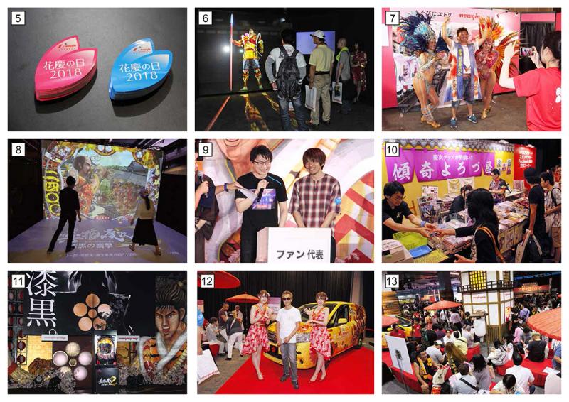 5/連れ慶のステッカー 6/「慶次出陣の間」で投影された慶次の大迫力3D映像 7/くじ引きでサンバのコスチュームを着た女性かボディビルの男性と一緒に記念撮影 8/サイバーパチンコ。投影されたパチンコ玉を蹴り、STARTに当てると変動開始 9/クイズ「慶次王決定戦」に出場した一般ファン 10/グッズ販売「傾奇よろず屋」にも人波が絶えなかった 11/8月6日導入予定の『CR真・花の慶次2 漆黒の衝撃』がお披露目された 12/花慶の痛車の前で記念撮影 13/休憩コーナーも花慶情緒満点