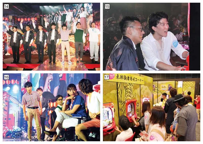 14/劇「初めてのパチンコ打ってみた!」には劇団員のほか、ニューギンの直営店の現役スタッフも出演した 15/劇に飛び入り参加、実機を打って感激の面持ちのパチンコ未体験者 16/パチンコ店での常連客やビギナー、定員などのやりとりを再現した 17/遊戯の間」の未体験者専用コーナー。コンパニオンやライターが遊び方をアテンドした