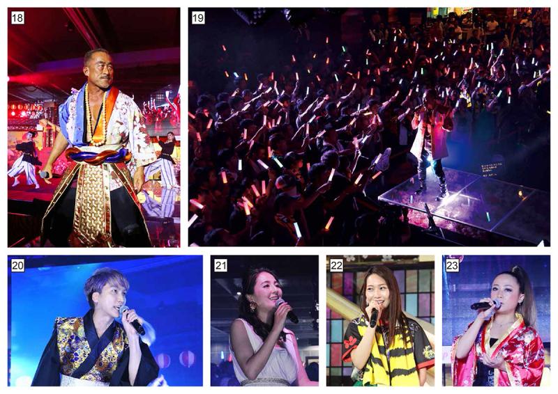 18/武士の風格を感じる角田信朗さんのステージ 19/サイリウムを振る観客とステージが一体となって盛り上がる角田さんのライブ 20/大西洋平さんも花慶のライブステージには欠かせないひとり 21/Mayumiさん 22/増田有華さん 23/信岡愛さん