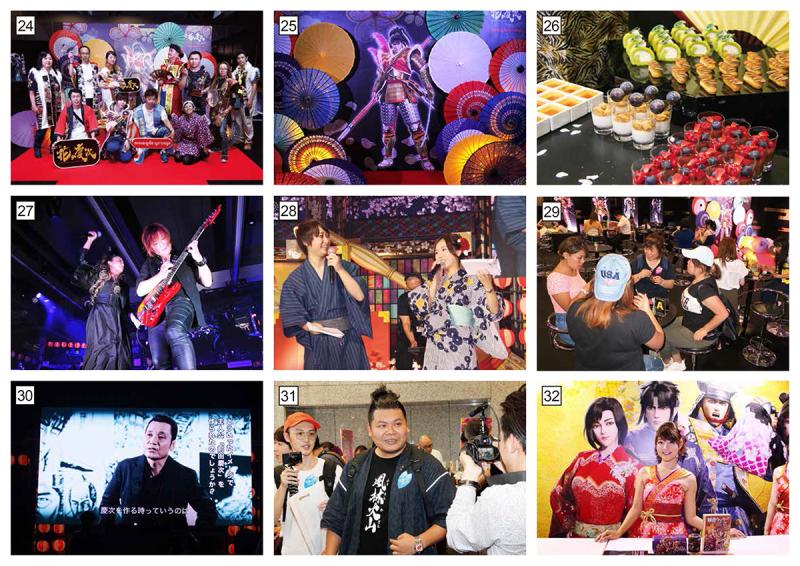 24/花慶のコスプレイヤーが全員揃って記念撮影 25/女性専用ラウンジの入り口の飾り付け 26/同ラウンジでオリジナルのスイーツ&ドリンクが提供された 27/ライブでのバンド演奏も話題のひとつ 28/助六さんと、かおりっきぃ☆さんはMC役も務めた 29/女性専用ラウンジ 30/原哲夫先生もビデオレターで出演 31/海外の人気YouTuberも取材に訪れた(写真中が鐵牛さん、左が華森さん。いずれも台湾出身) 32/帰る時は傾奇クッキーなどのお土産がプレゼントされた