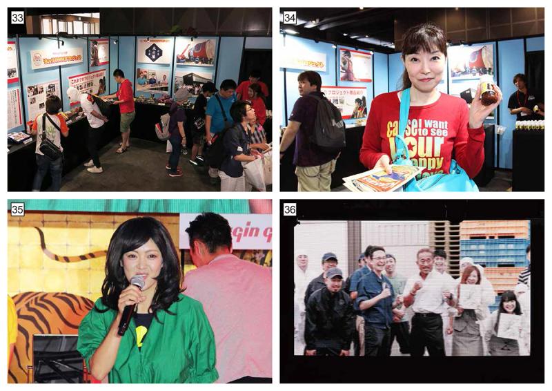 33/社会貢献活動紹介ブース 34/Buy! TOHOKU製品のドレッシングを来場者にプレゼント 35/「福魂祭」ライブが縁で「花慶の日」にも出演した物まねタレントのみかんさん 36/木の屋石巻水産を視察した角田さんも映像で紹介された