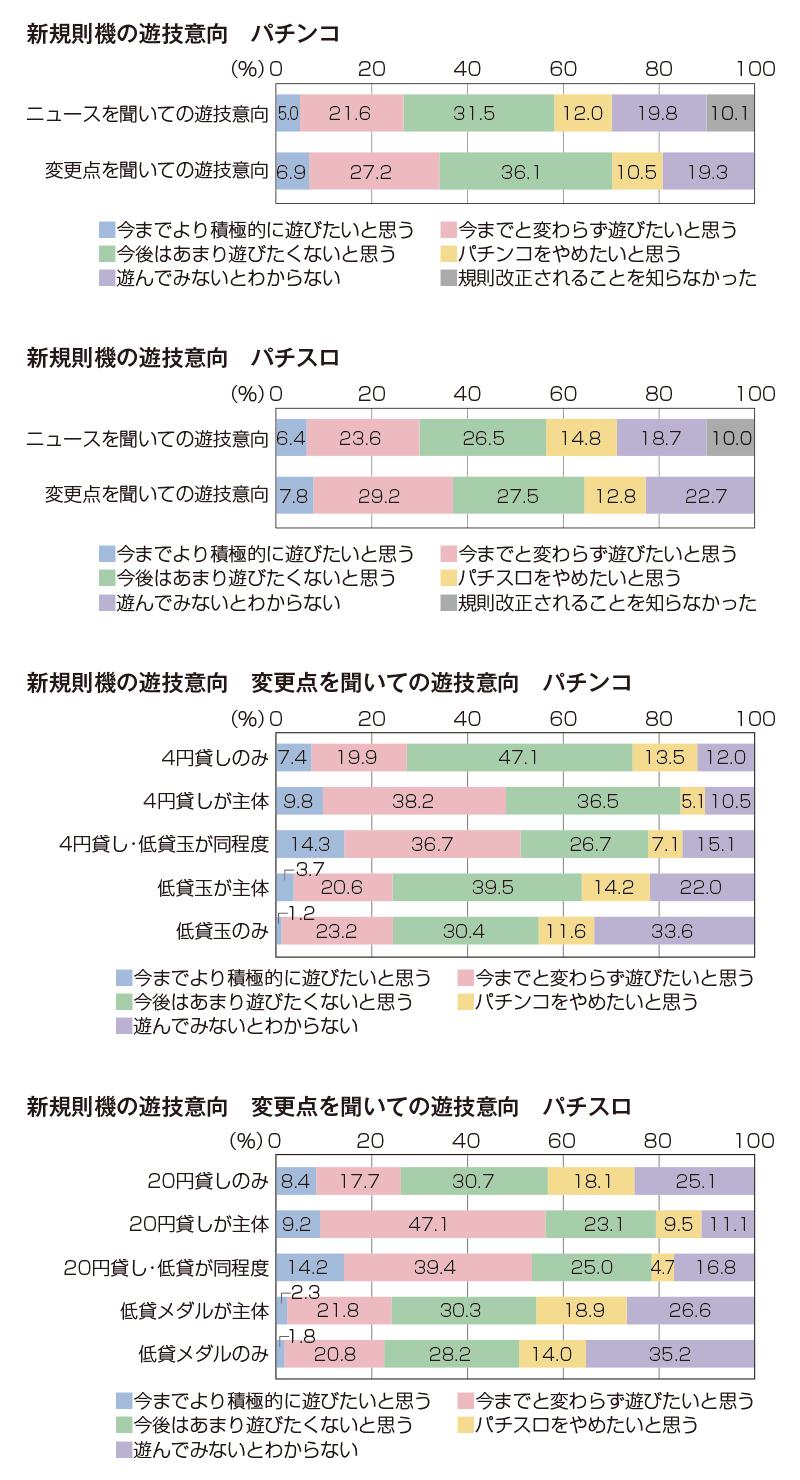 パチンコ参加者全体で規則改正後のパチンコに遊技意向を示したプレイヤーの割合は前述の通り34.1%だが、主に遊技する料金タイプによってブレイクダウンすると、「4円貸し・低貸玉が同程度」層では51%と相対的に高かったのに対して、「低貸玉が主体」層では24.3%、「低貸玉のみ」層では24.4%にとどまった。また、遊技する目的意識によってブレイクダウンすると、「遊びとして」層だけが53.8%と相対的に高く、これ以外の層はおおむね同水準で28%~33%の範囲の中に納まっていた。