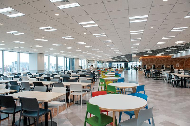 700席・約2000人の喫食に対応できる9階フロアの社員食堂も、グループ社員の交流が図れる場だ。常時開放されている上、カフェやバーも併設。ダーツやビリヤードといったアイテムも備えている。