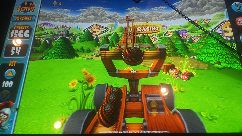 マシンに座り、20ドルを投入しました。ひとつの筐体内に複数のゲームが入っていて、遊ぶゲームを選択できます。小生が選択したのは投石器で敵を倒すというゲームで、投石器の方向や引っ張る角度で結果が異なります。石弾を発射したり、特別な効果がある石弾を購入するとクレジットが減り、敵を倒すとクレジットが増えるというモノです。