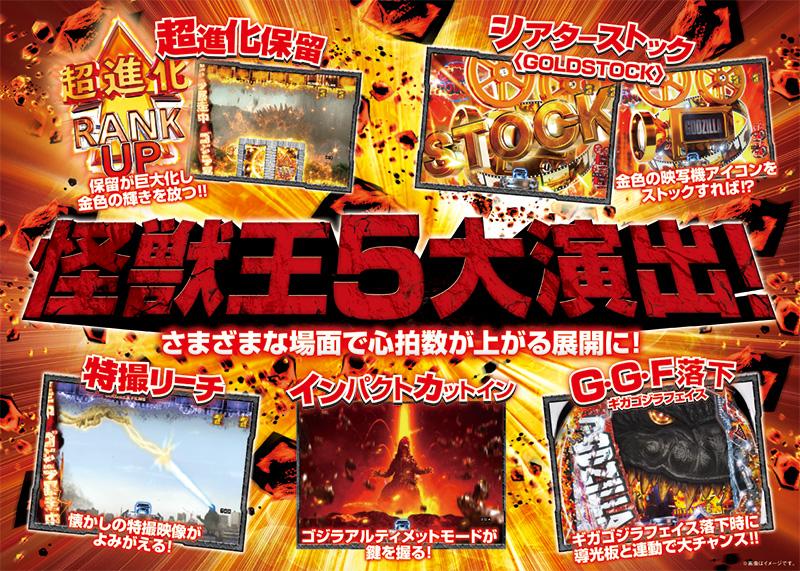 パチンコオリジナルの深紅のゴジラが襲来する「ゴジラアルティメットモード」を搭載。怒れば怒るほど勝利に近づく演出で、敵怪獣との手に汗握るバトルは見ものだ。ほかにも「超進化保留」「シアターストック」「特撮リーチ」「インパクトカットイン」「G・G・F(ギガゴジラフェイス)落下」の怪獣王5大演出がユーザーを興奮させる。導入は11月中旬からを予定している。