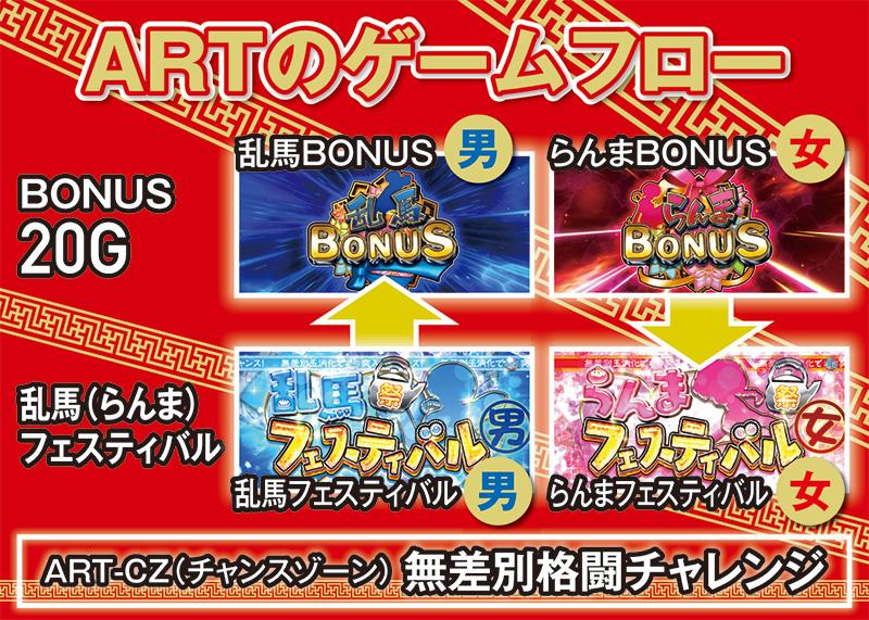 通常時、BONUS中、ART中とすべての場面でカギを握るのが変身リプレイ(リプレイ・リプレイ・ベル)。変身リプレイ成立後に乱馬(男)がらんま(女)に変身すればチャンスになる。BONUS中ならばART-CZ「無差別格闘チャレンジ」獲得の、ART中ならばARTが終わらない「らんまフェスティバル」昇格のチャンスとなる。大量獲得のトリガー役となるART-CZ獲得の特化ゾーン「熊猫的衝撃」「神拳チャンス」「ハッピータイム」も搭載している。導入は11月上旬を予定。