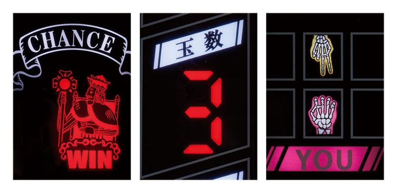 まず目を引くのは、盤面のゲージ。原作に登場する「沼」は、縦に長い構造で、威圧感と存在感で見る者を圧倒する。本機は、現行機で類を見ない約500本もの釘を使用。さらに盤面領域を狭めることでプレイヤーに強烈なインパクトを与える。すなわち、「一度は座って打ってみよう」という気にさせる外観なのだ。