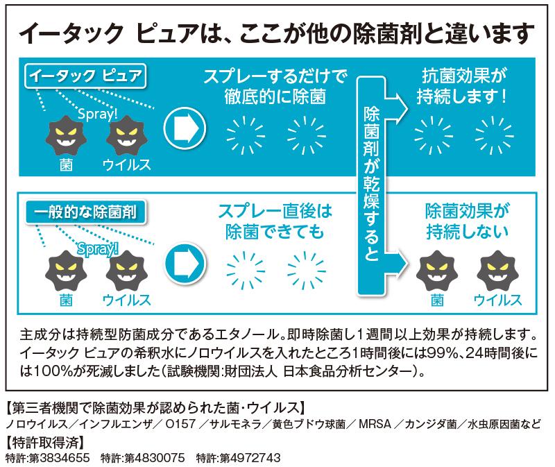 最大の特長は、防菌・防ウイルス効果が持続すること。一般的な除菌剤は、除菌剤を吹き付けた直後に効果を発揮するが、吹き付けた部分が乾燥すると付着した菌やウイルスは除菌することができず除菌効果は続かない。