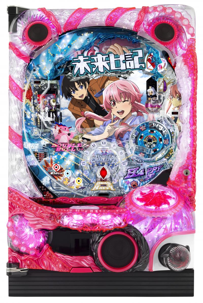 本機はKADOKAWAサスペンス作品の決定版「未来日記」とタイアップ。未来の出来事が日記として書き込まれる携帯=未来日記の所有者間で繰り広げられる殺人ゲームを描くサスペンス・アクションだ。2011年からTVアニメ全26話が放送され、2012年にはドラマ化もされた人気コンテンツだ。