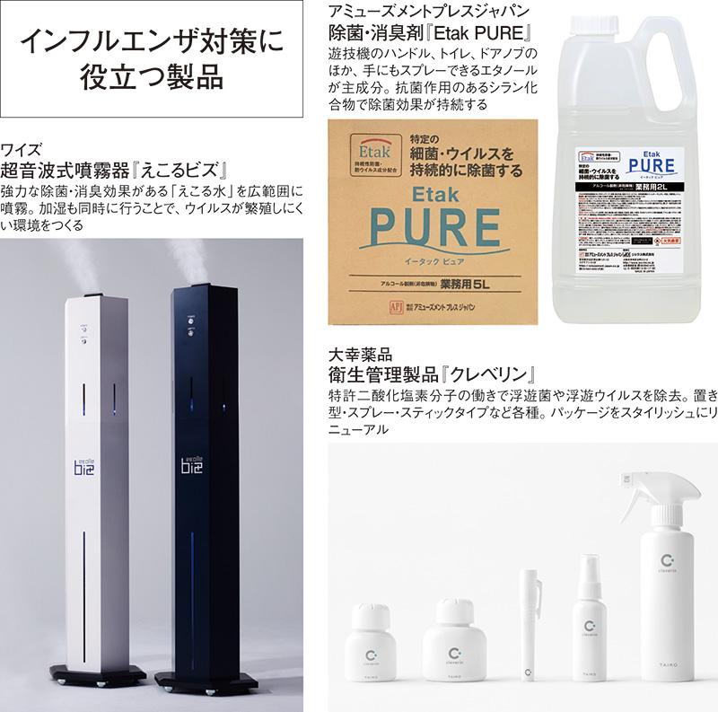 除菌剤をホールの備品としてだけでなく景品として置き、家庭でもインフルエンザ対策をしてもらうことも、「清潔なホール」のアピールに繋がる。二酸化塩素分子の働きで効果を高めた製品もあり、据え置き型、携帯型などタイプもさまざま。他店との差別化のためにもぜひ用意したい製品だ。