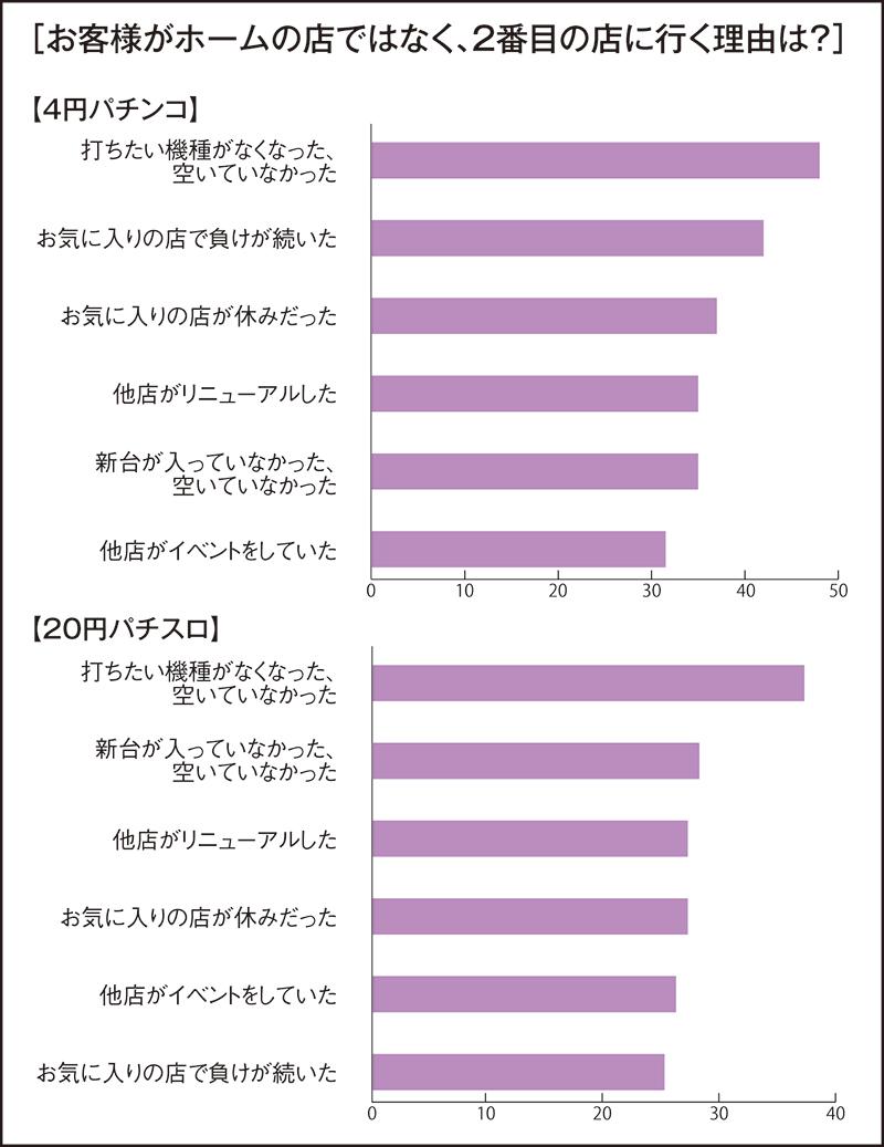 下のグラフは、ネクステリアが行ったアンケート(複数回答。上位のみ掲載)。ホームの店舗を変更する理由で最も多かったのが、4円パチンコ・20円パチスロともに、「打ちたい機種がなくなった、空いていなかった」という回答だ。この回答の多さは、打ちたい台の撤去は、ホームを変更する大きな動機になることを物語る。