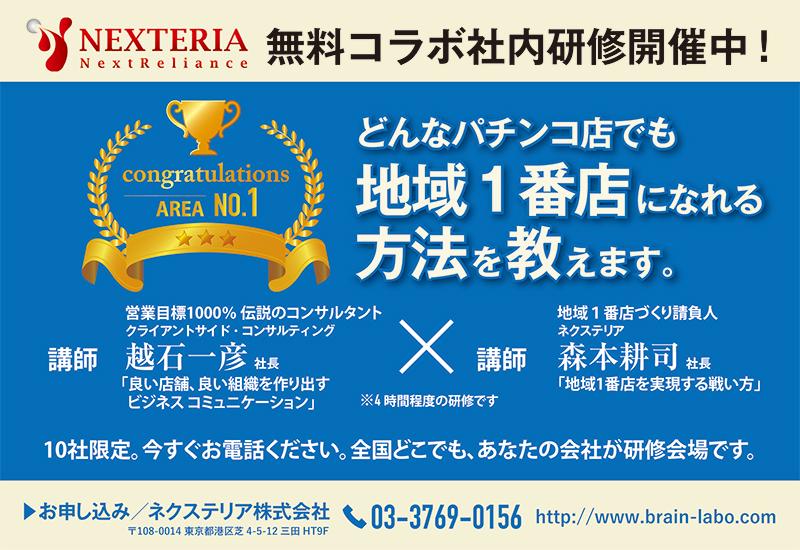 ネクステリアは、地域1番店になるためのコラボ社内研修を先着10社無料で実施している。講師は、担当する47のホール法人すべてで、売上を105%~375%向上させた同社の森本耕司社長。そして、組織力強化の分野では日本トップクラスのコンサルタントであるクライアントサイド・コンサルティングの越石一彦社長だ。