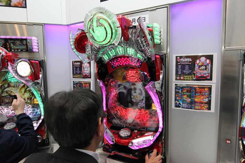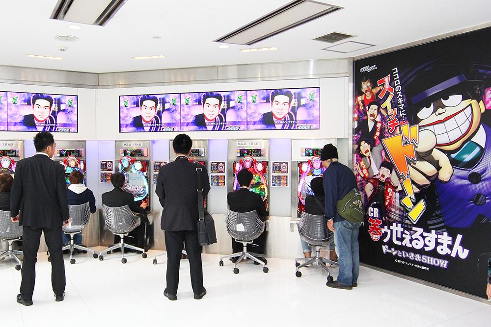 サンセイアールアンドディは11月12日から、東京・上野のショールームで『CR笑ゥせぇるすまん ドーンといきまSHOW』の内覧会を開催。大当たり確率:1/319.68のV確ST機。右打ち中の70%が2080個(16R)払い出しのある注目機を試打しようと、大勢のホール関係者が訪れた。