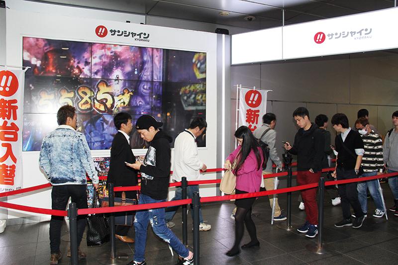 サンシャインKYORAKU栄(名古屋市中区)では、4円貸しコーナーに17台、1・25円貸しコーナーに3台、『ぱちんこ 新鬼武者 超・蒼剣』を導入した。「午前8時に整理券を配布、9時オープン15分前の再整列時には長い列ができました」(中村稔店長)。